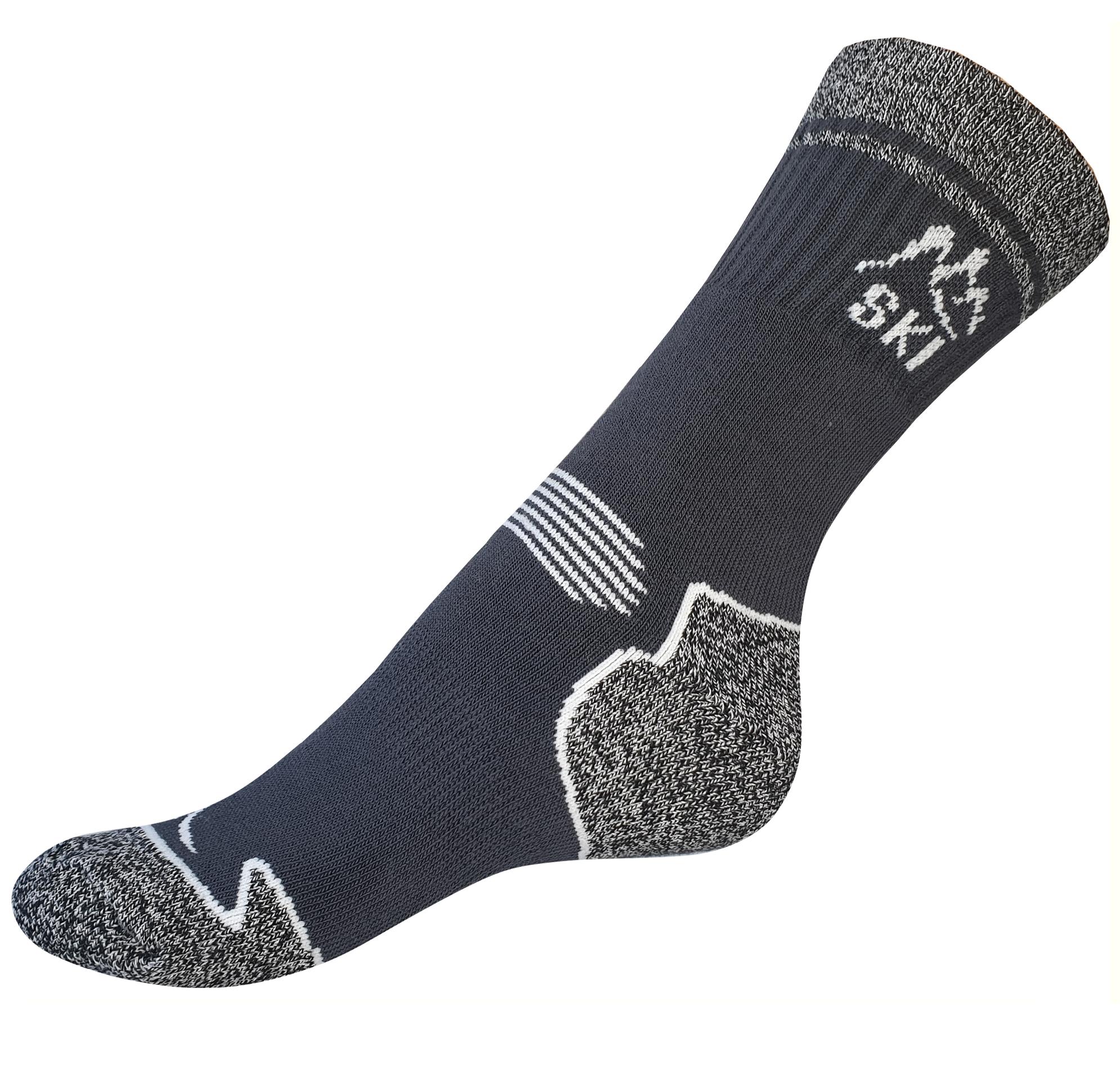 VšeProBoty ponožky SKI jsou zimní celofroté vyšší ponožky, navržené pro chladné podmínky. Jedná se o lýtkové a tlusté ponožky, které jsou opatřeny sportovním lemem gumy a elastanem pro lepší přizpůsobení. Zdvojená pata a špice zvyšují odolnost při nošení.