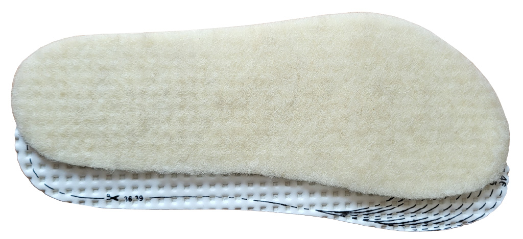 - Nášlapná vrstva – přírodní ovčí rouno: izoluje teplo a odvádí vlhkost.